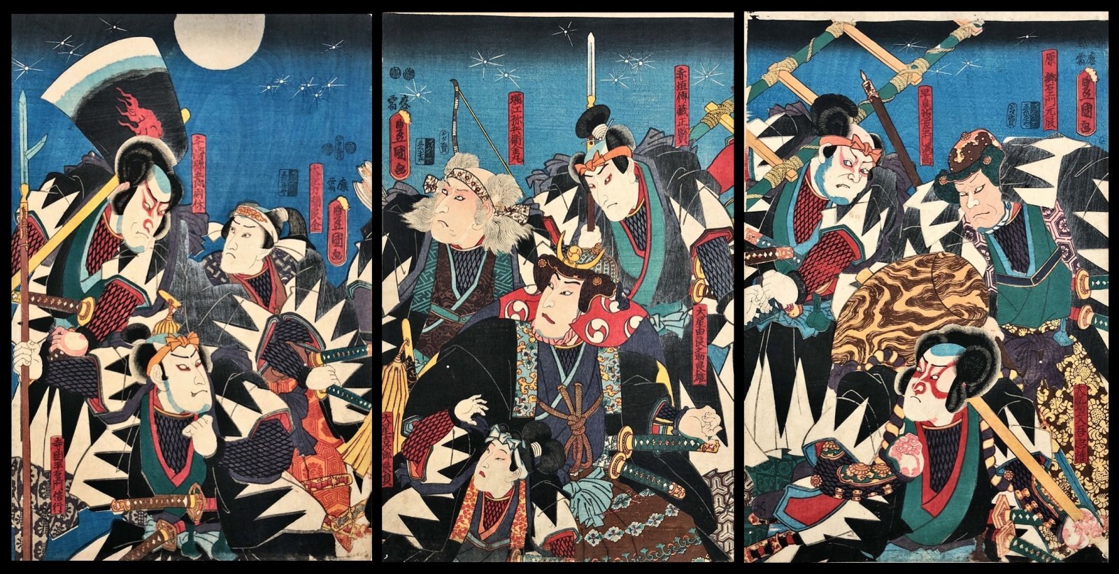豊国三代役者絵「原郷右衛門元辰」「早見惣左衛門満高」「大鷹文吾忠雄」「大星由良之助良雄」「赤垣伝蔵正覧」「堀江弥兵衛金丸」「大星吉次郎良員」「大星力弥良金」「千崎弥五郎則休」「寺岡平右衛門信行」