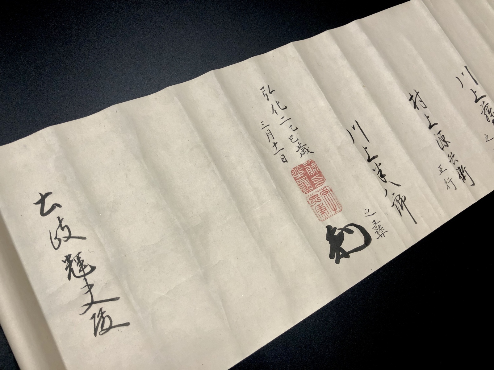 弘化2年伝授 川上半八郎之彝(花押・落款)ヨリ土岐輝夫宛 約18×830cm(長巻) 経年良好