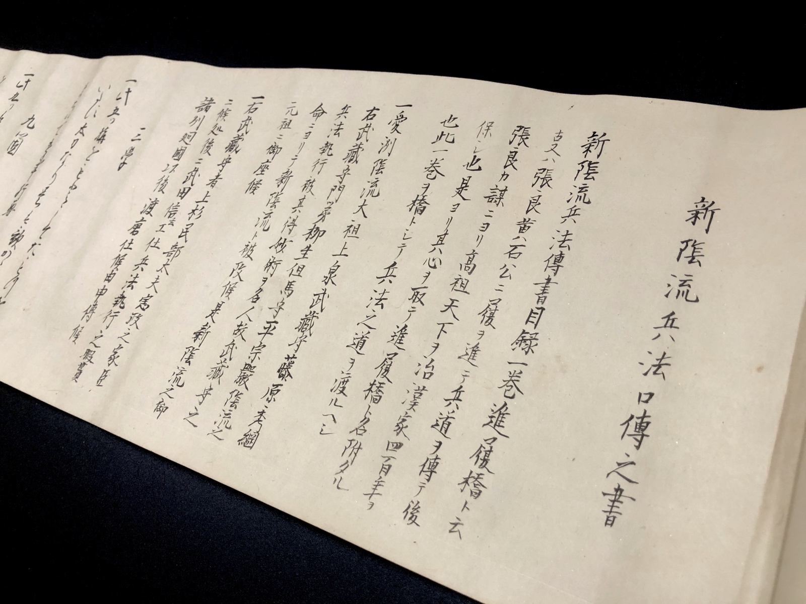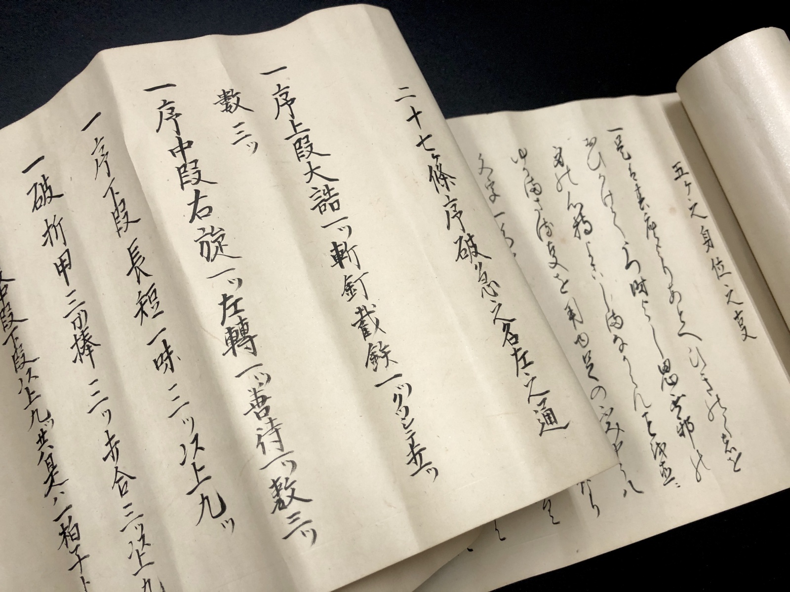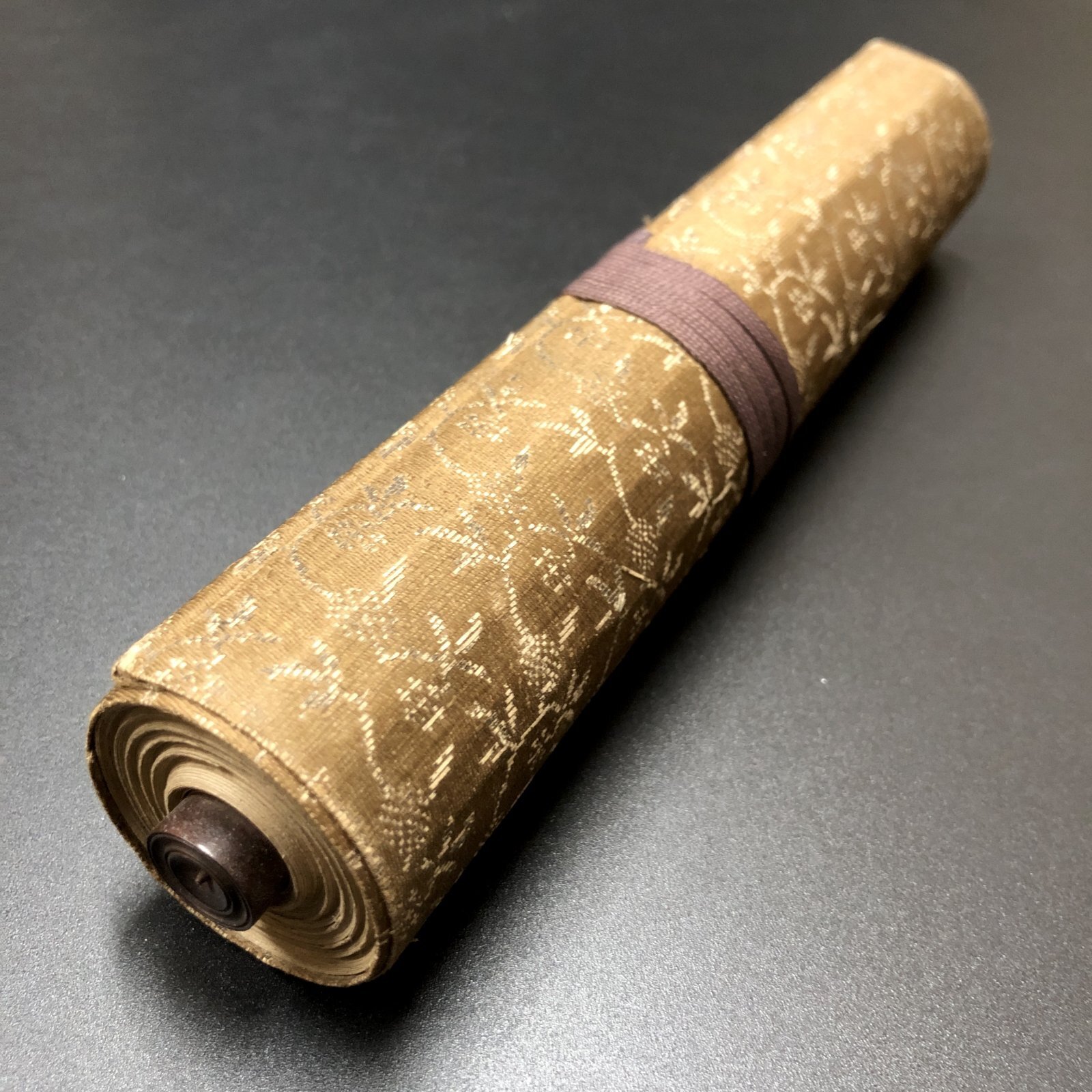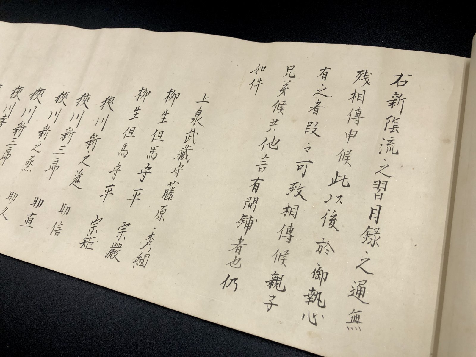 文政八年伝授 狭川新之烝将長(花押・落款)ヨリ男沢三郎宛 20×650cm 原装緞子表紙 経年シミ
