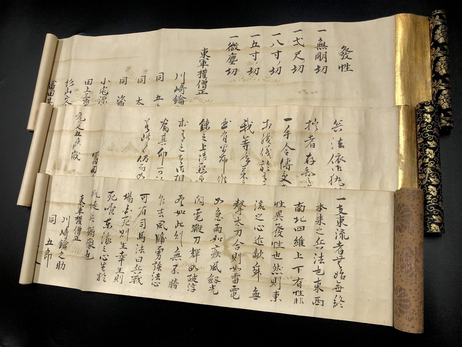 ・序之巻(仮題):約18×160糎・発性:約18×150糎・許之巻:約18×130糎 各軸頭欠