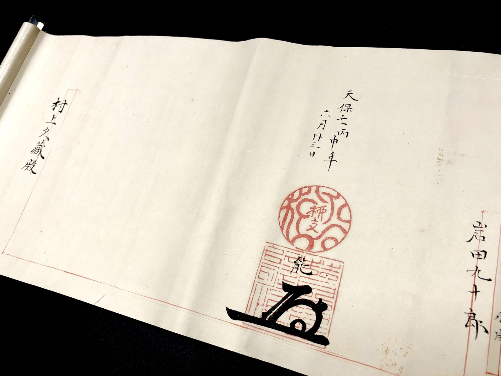 天保七年伝授 岩田九十郎能哲(花押・落款)ヨリ村上久蔵宛 約18×395cm 原装