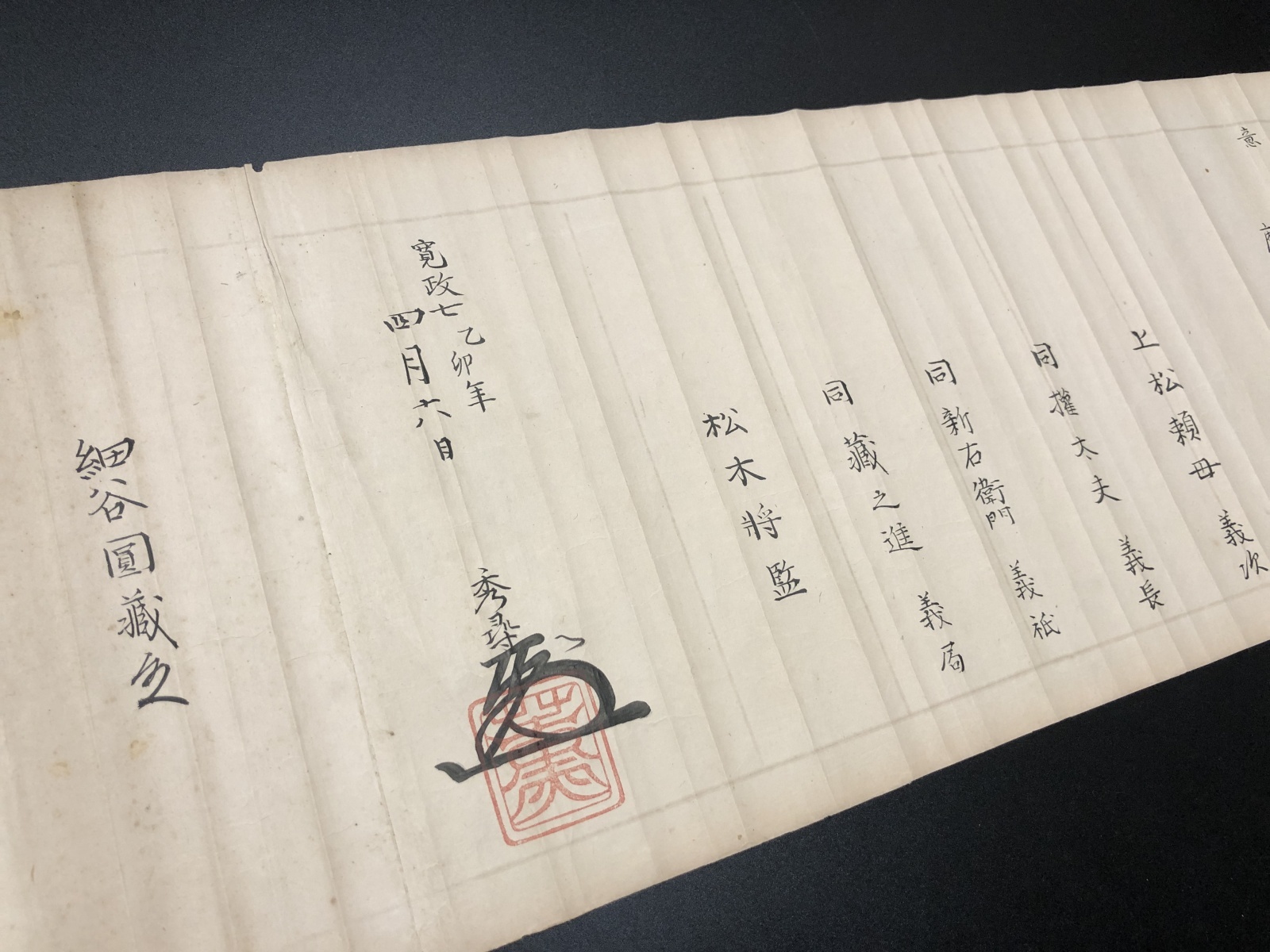 寛政七年伝授 松木将監秀尋(花押・落款)ヨリ細谷圓蔵宛