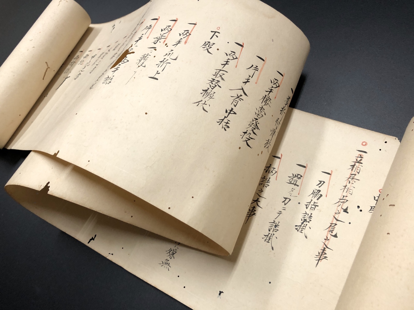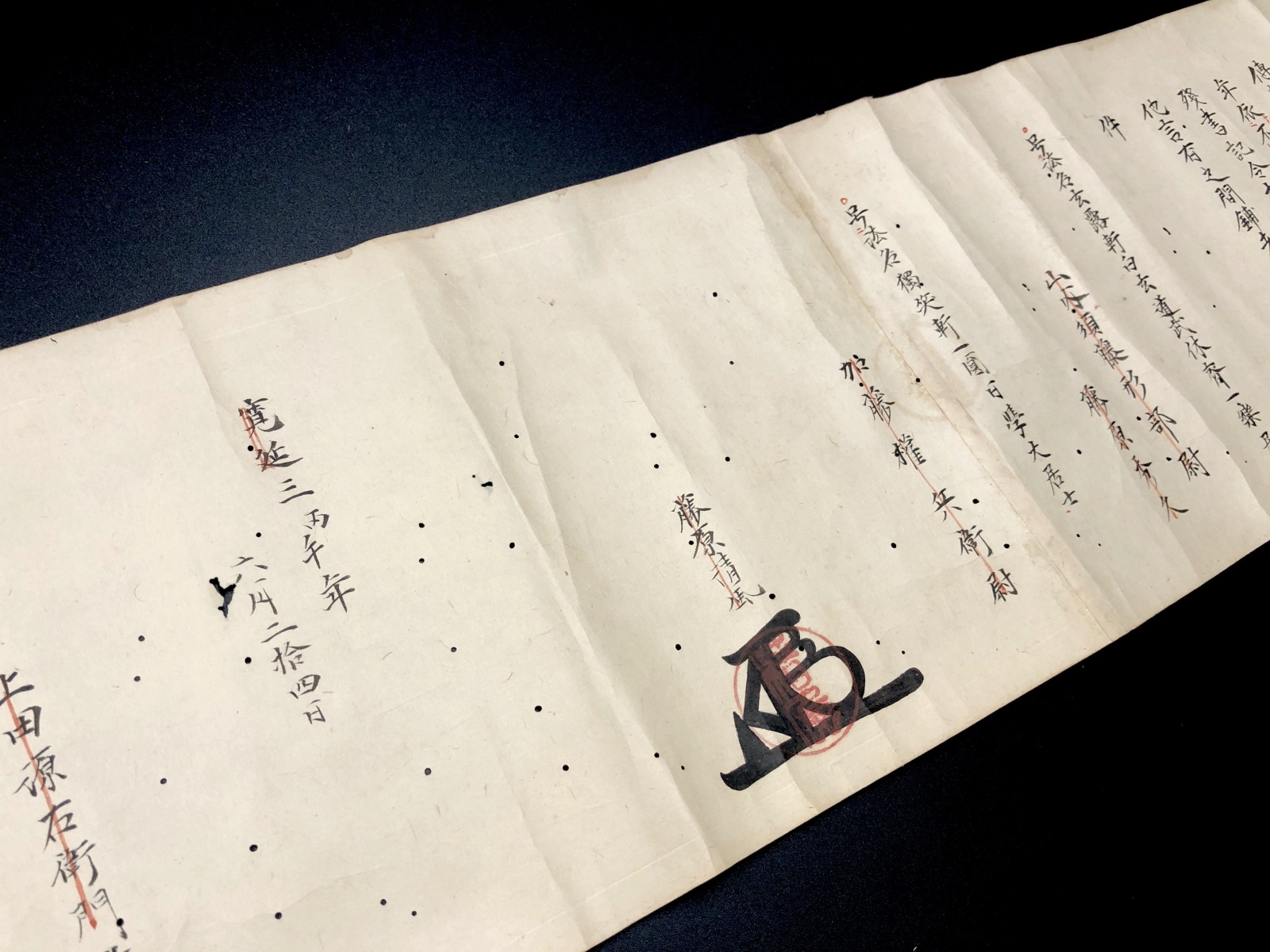 寛延三年伝授 加藤権兵衛清風(花押・落款)ヨリ上田源右衛門宛 約17×980糎(長巻) 所々虫損・シミ